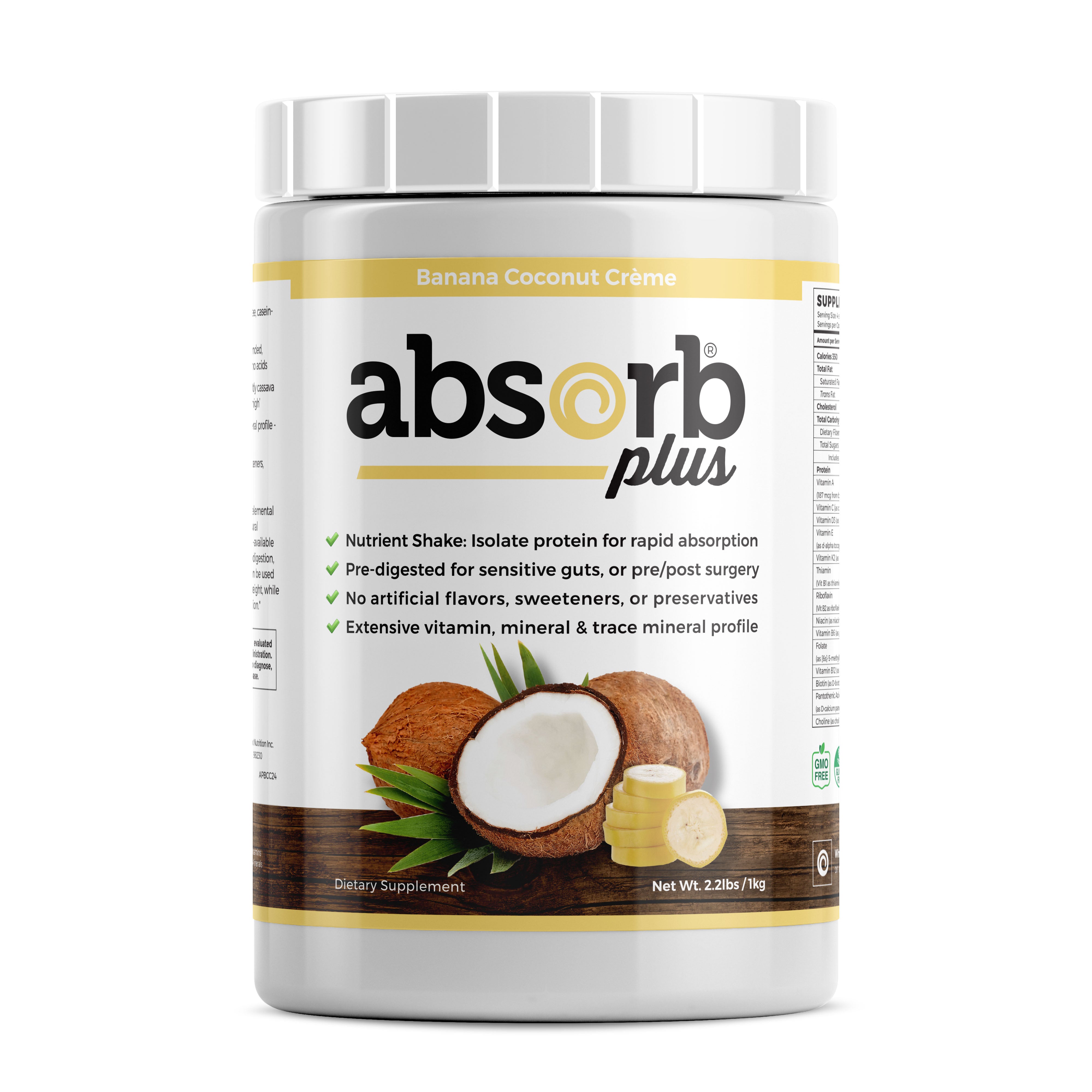 Absorb Plus Banana Coconut Crème is a delicious, nutrient shake comprised of all-natural ingredients in the most bioavailable forms. It requires very little digestion and is absorbed quickly.