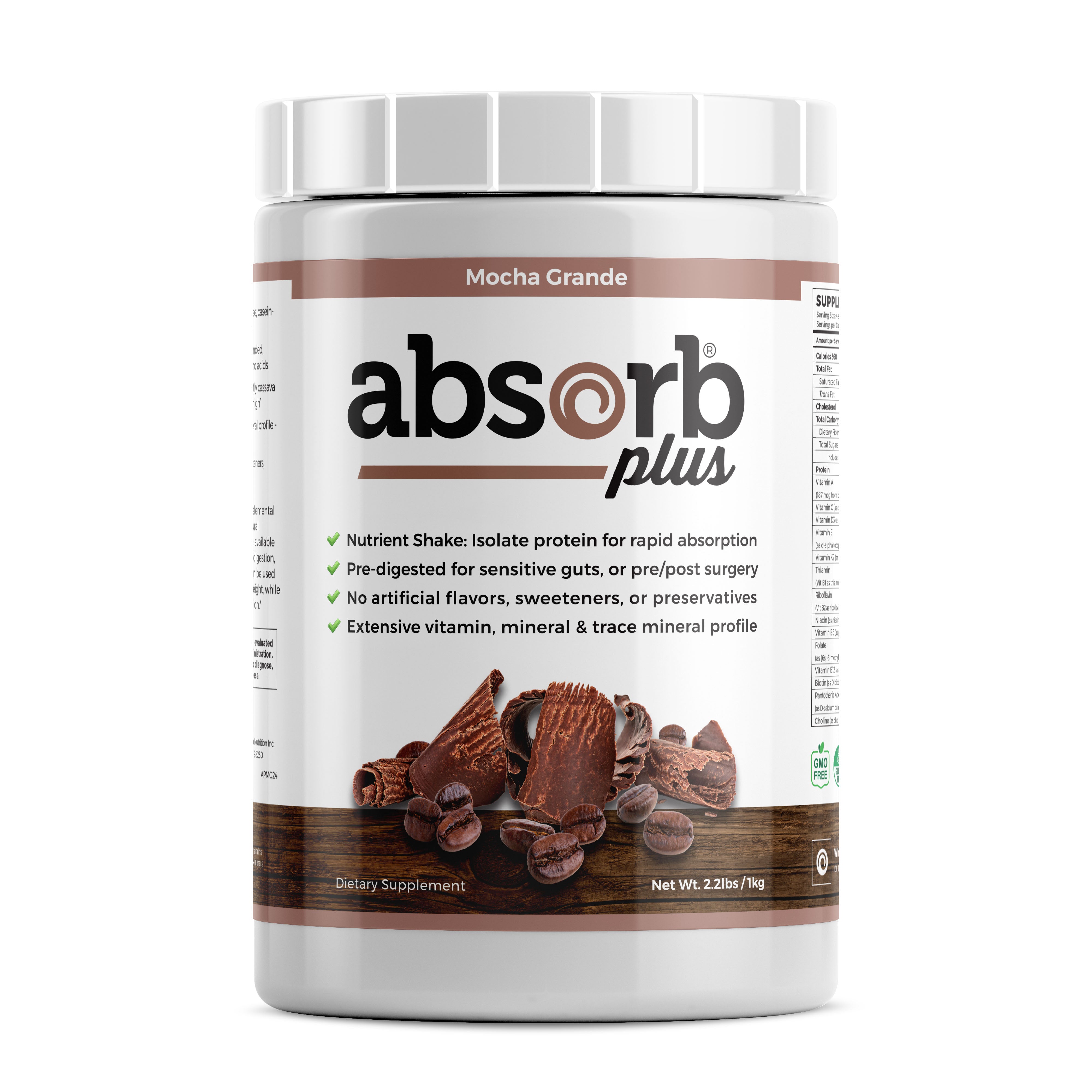 Absorb Plus Mocha Grande is a delicious, nutrient shake comprised of all-natural ingredients in the most bioavailable forms. It requires very little digestion and is absorbed quickly.