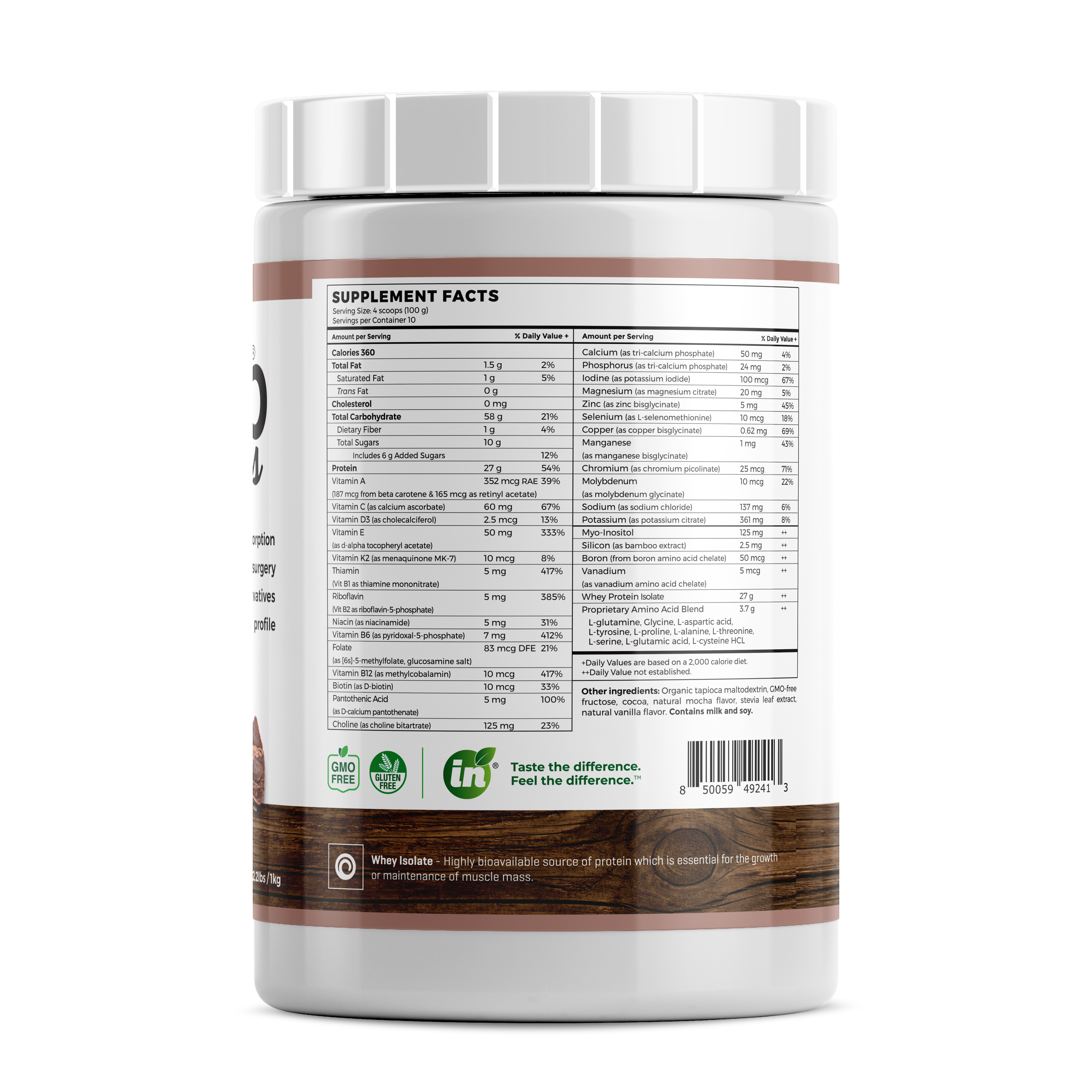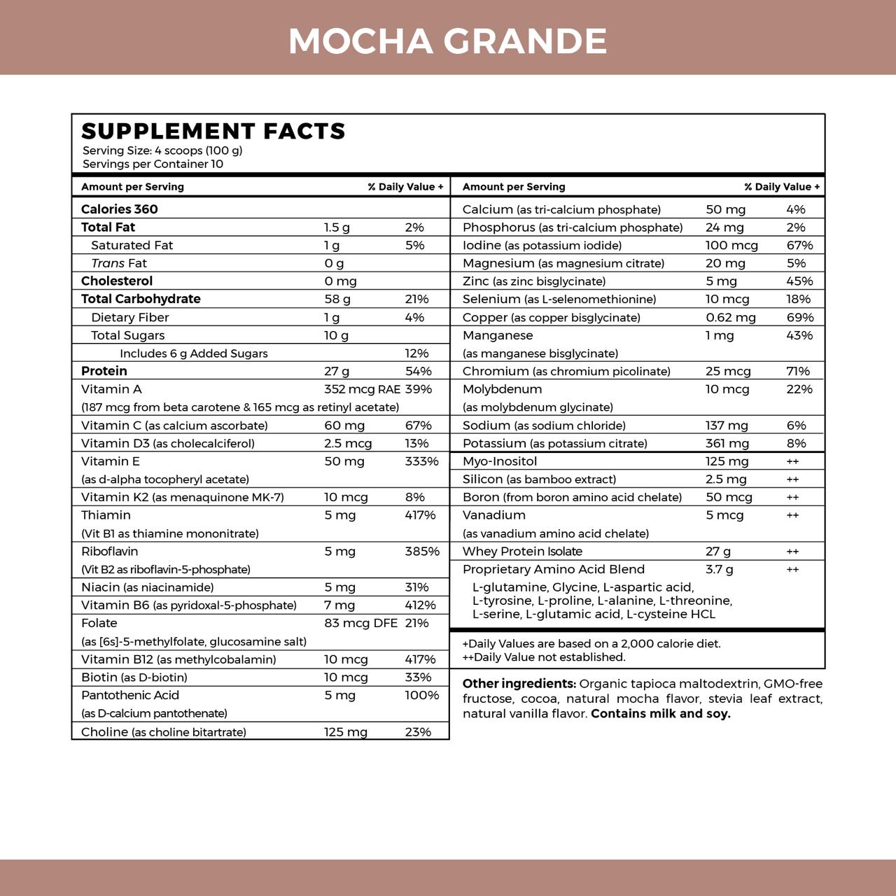 Ingredients: Organic Cassava Root (Tapioca) Maltodextrin, Whey Protein Isolate (milk, soy), Proprietary Amino Acid Blend: L-glutamine, L-glycine, L-aspartic acid, L-tyrosine, L-proline, L-alanine, L-threonine, L-serine, L-glutamic acid, L-cysteine, Vitamin A (as beta carotene), Vitamin C (as calcium ascorbate), Vitamin D3 (as cholecalciferol), Vitamin E (as d-alpha tocopheryl acetate), Vitamin K2 (as menaquinone MK-7), Thiamin (Vitamin B1 as thiamine mononitrate), Riboflavin (Vitamin B2 as riboflavin-5-phosphate), Niacin (as niacinamide), Vitamin B6 (as pyridoxal-5-phosphate), Folate, Vitamin B12 (as methylcobalamin), Biotin (Vitamin B7 as D-biotin), Pantothenic Acid (Vitamin B5 as d-calcium pantothenate), Calcium (as calcium phosphate), Phosphorus (as calcium phosphate), Iodine (as potassium iodide), Magnesium (as magnesium citrate), Zinc (as zinc bisglycinate), Selenium (as L-selenomethionine), Copper (as copper bisglycinate), Manganese (as manganese bisglycinate), Chromium (as chromium picolinate), Molybdenum (as molybdenum glycinate), Sodium (as sodium chloride), Potassium (as potassium citrate), Choline, Inositol, Silicon (as bamboo extract), Vanadium (as vanadium amino acid chelate), GMO-free fructose, cocoa, natural mocha flavour, stevia leaf extract, natural vanilla flavour.