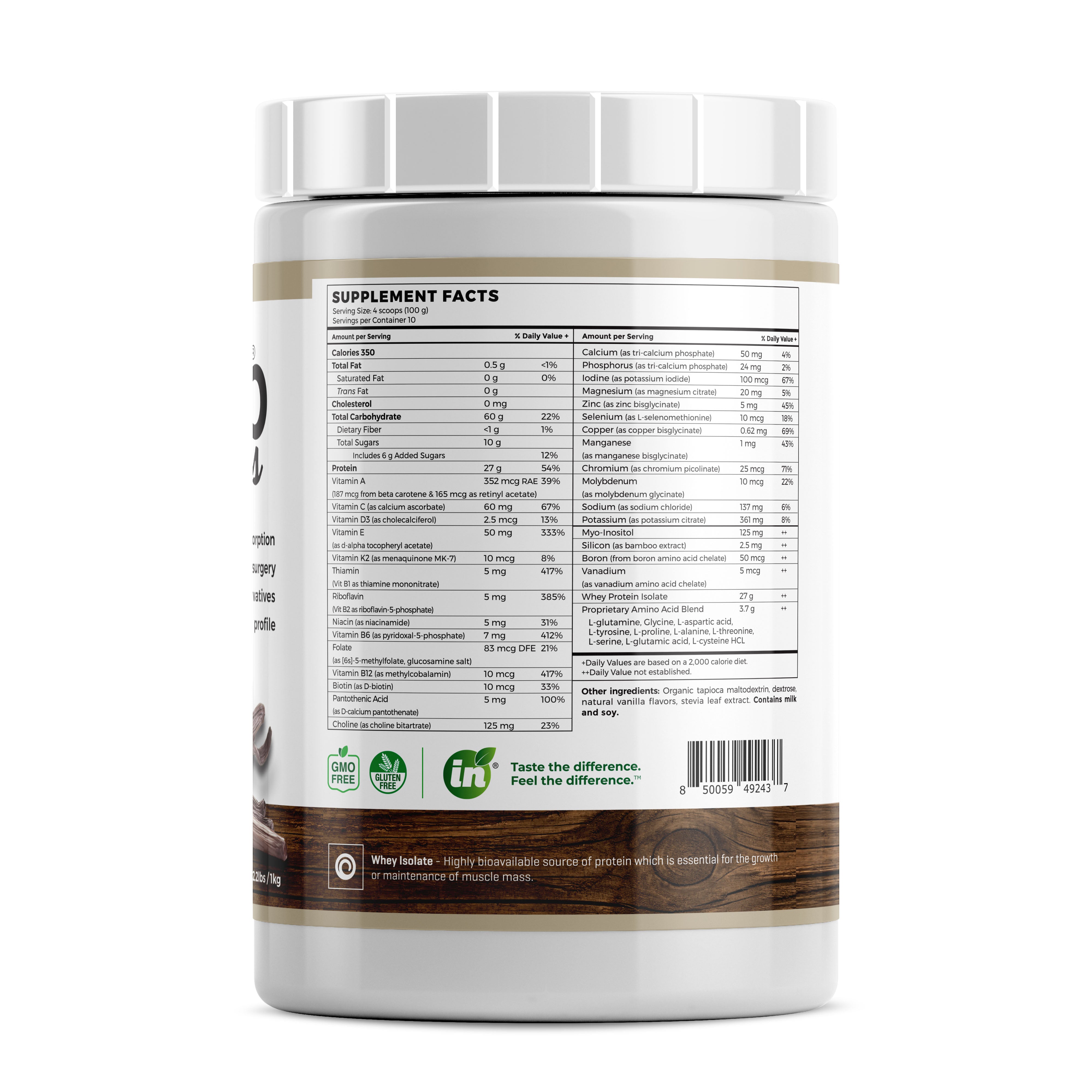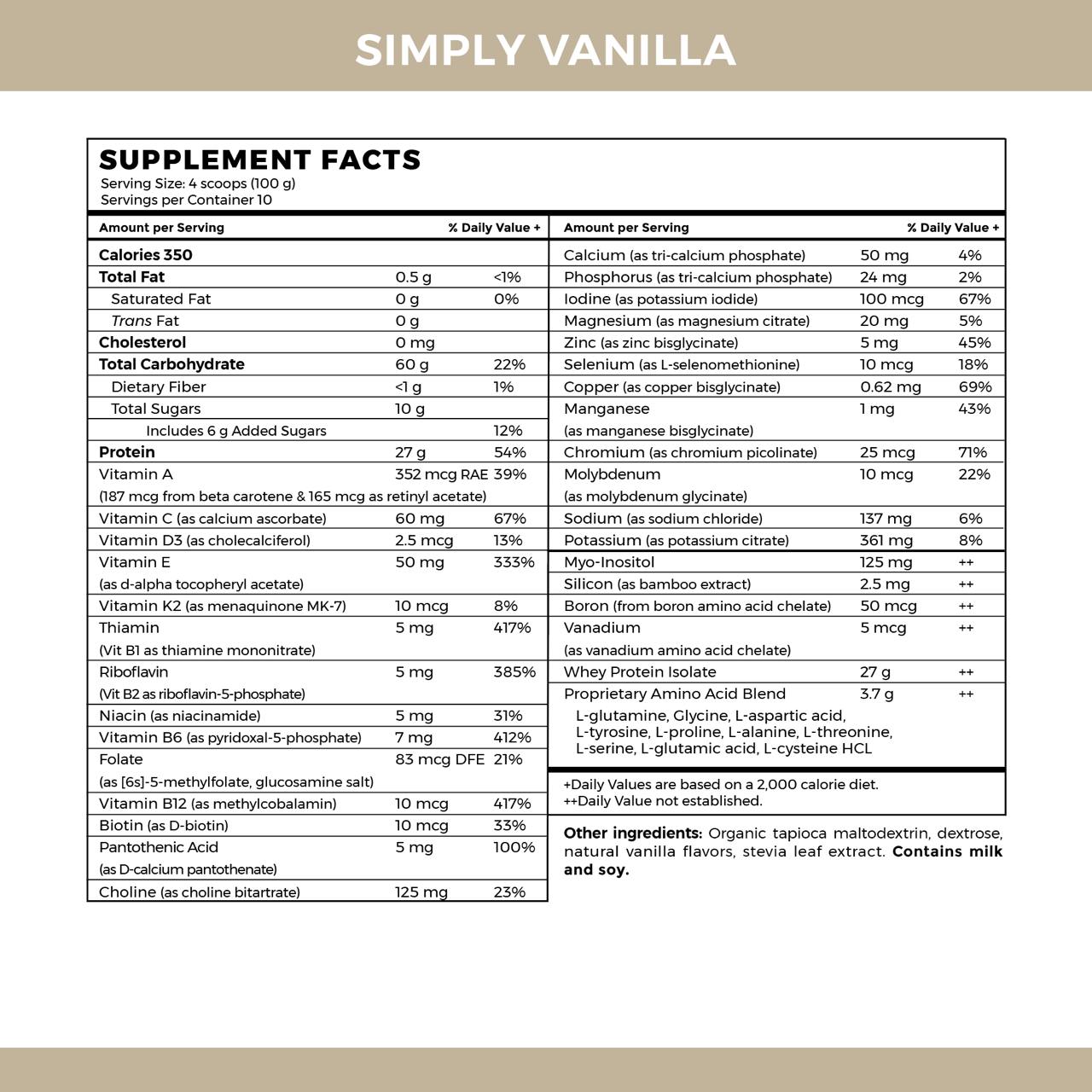 Ingredients: Organic Cassava Root (Tapioca) Maltodextrin, Whey Protein Isolate (milk, soy), Proprietary Amino Acid Blend: L-glutamine, L-glycine, L-aspartic acid, L-tyrosine, L-proline, L-alanine, L-threonine, L-serine, L-glutamic acid, L-cysteine, Vitamin A (as beta carotene), Vitamin C (as calcium ascorbate), Vitamin D3 (as cholecalciferol), Vitamin E (as d-alpha tocopheryl acetate), Vitamin K2 (as menaquinone MK-7), Thiamin (Vitamin B1 as thiamine mononitrate), Riboflavin (Vitamin B2 as riboflavin-5-phosphate), Niacin (as niacinamide), Vitamin B6 (as pyridoxal-5-phosphate), Folate, Vitamin B12 (as methylcobalamin), Biotin (Vitamin B7 as D-biotin), Pantothenic Acid (Vitamin B5 as d-calcium pantothenate), Calcium (as calcium phosphate), Phosphorus (as calcium phosphate), Iodine (as potassium iodide), Magnesium (as magnesium citrate), Zinc (as zinc bisglycinate), Selenium (as L-selenomethionine), Copper (as copper bisglycinate), Manganese (as manganese bisglycinate), Chromium (as chromium picolinate), Molybdenum (as molybdenum glycinate), Sodium (as sodium chloride), Potassium (as potassium citrate), Choline, Inositol, Silicon (as bamboo extract), Vanadium (as vanadium amino acid chelate), dextrose, natural vanilla flavour, stevia leaf extract.