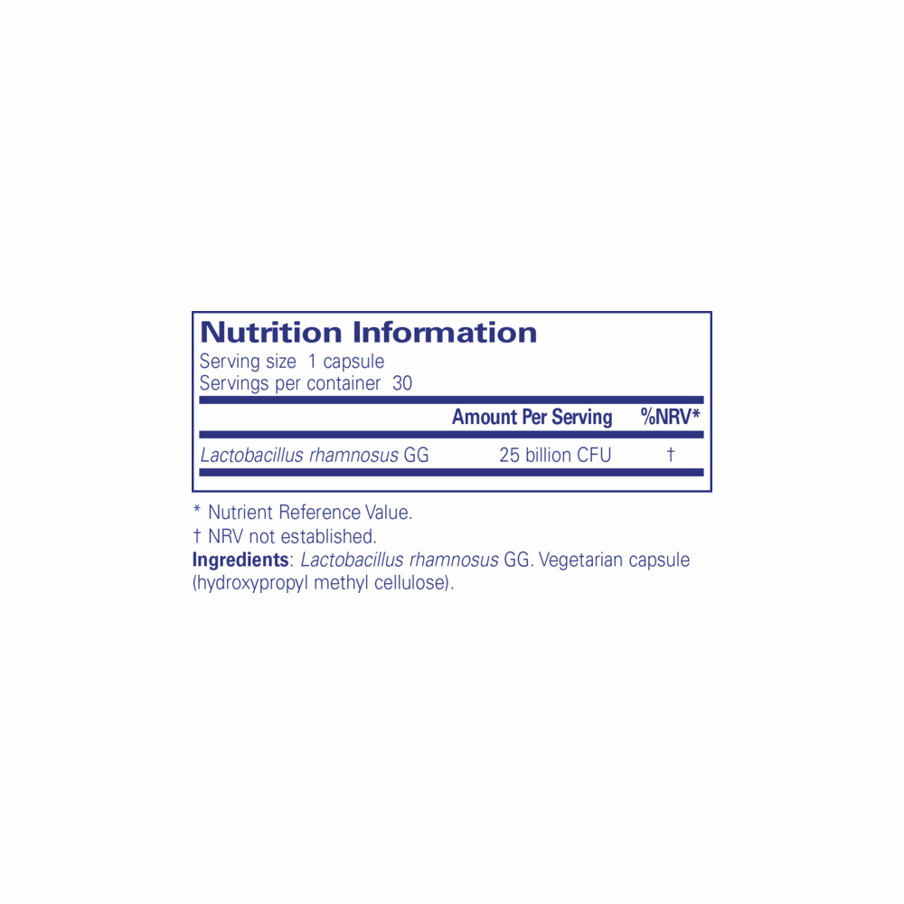 ProFloraGG 25B offers 25 billion CFU per capsule of Lactobacillus rhamnosus GG.